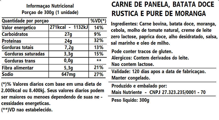 100g carne de panela + 100g batata doce assada + 100g purê de moranga