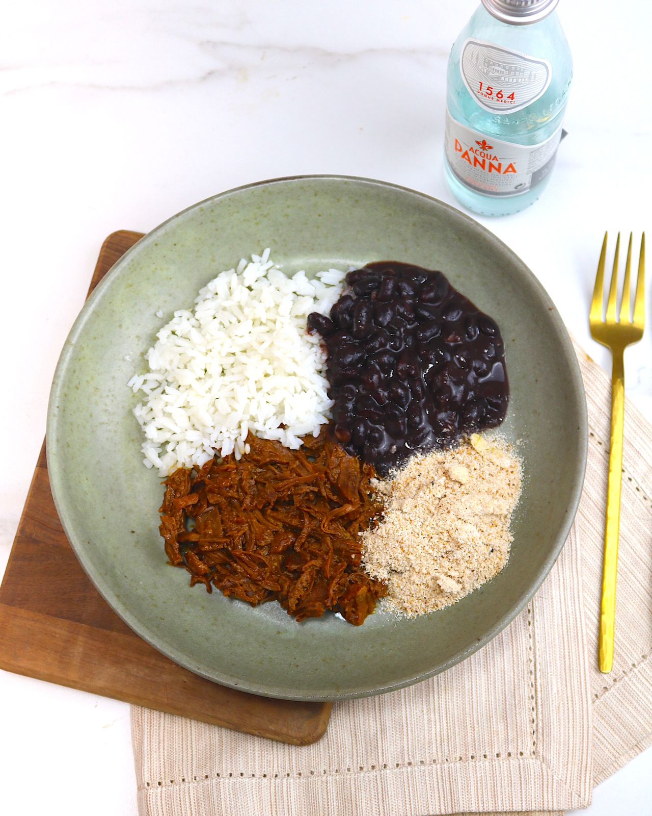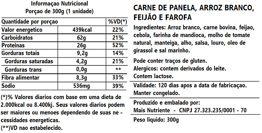 80g carne de panela + 80g arroz branco + 100g feijão + 40g farofa