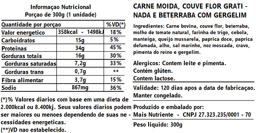 100g carne moída + 120g couve flor ao molho branco gratinada + 80g beterraba