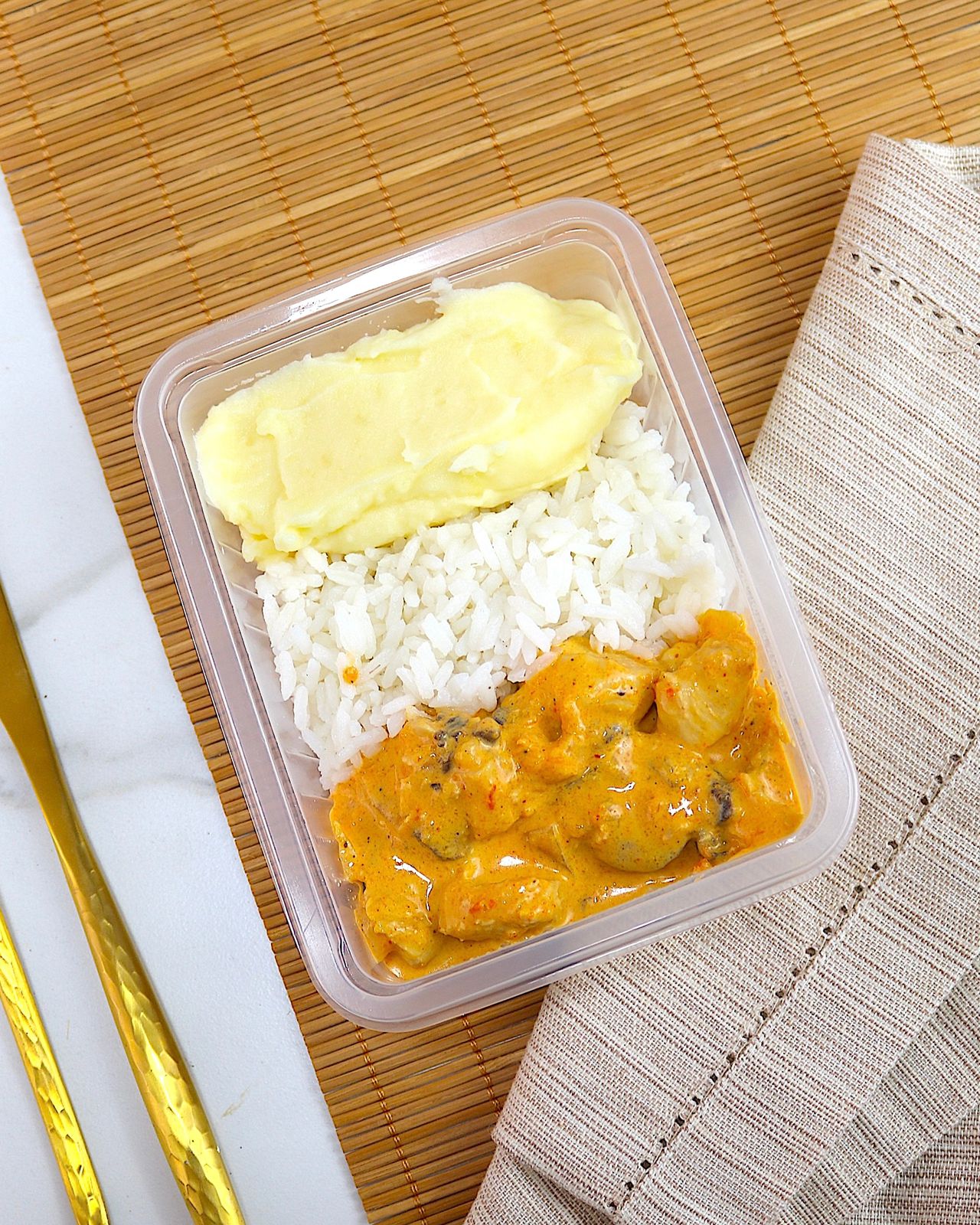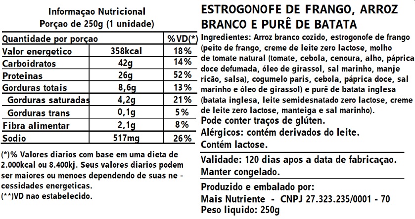 ESTROGONOFE DE FRANGO, ARROZ BRANCO E PURÊ DE BATATA INGLESA - 250g