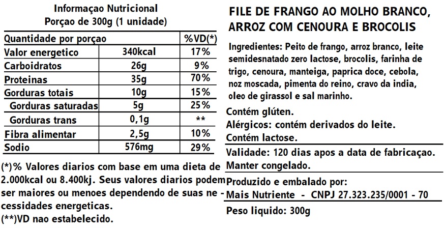 80g filé de frango + 90g molho branco + 90g arroz branco com cenoura + 40g brócolis
