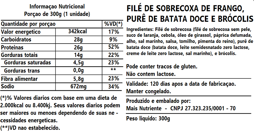 100g filé de sobrecoxa + 120g purê de batata doce + 80g brócolis