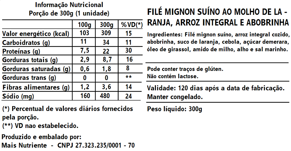 FILÉ MIGNON SUÍNO AO MOLHO DE LARANJA, ARROZ INTEGRAL E ABOBRINHA - 300g