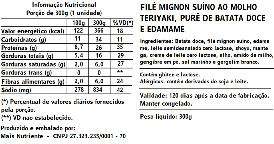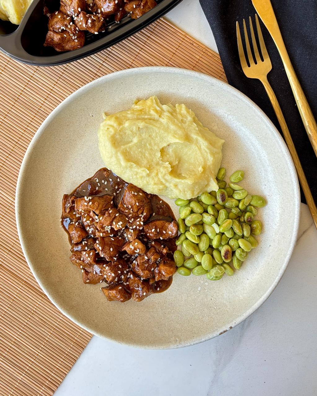 100g filé mignon suíno ao molho teriyaki + 150g purê de batata doce + 50g edamame