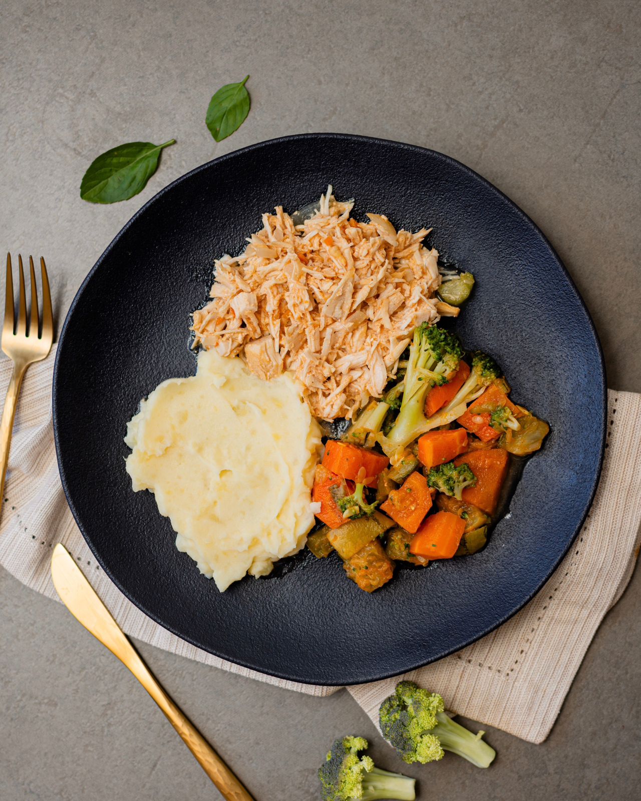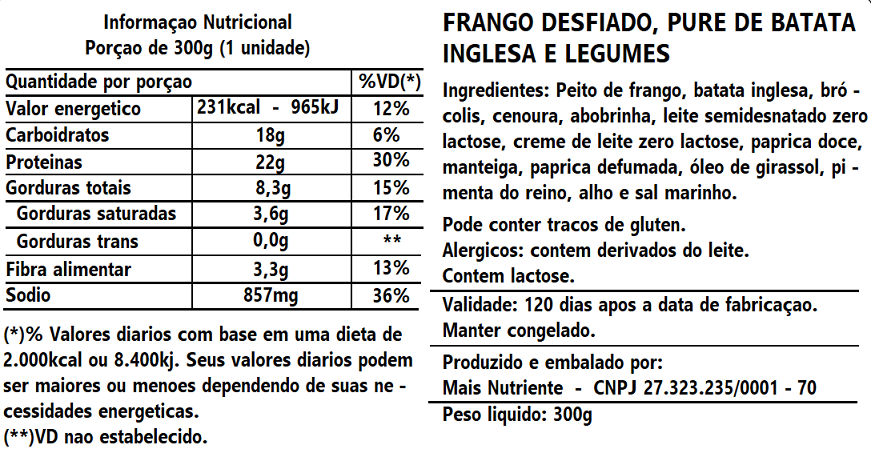 100g frango desfiado + 100g purê de batata inglesa + 100g legumes