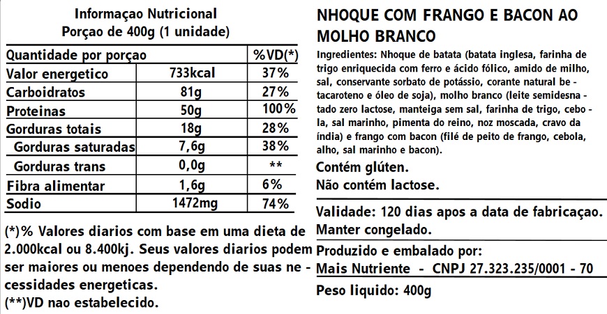150g nhoque + 100g frango com bacon + 150g molho branco