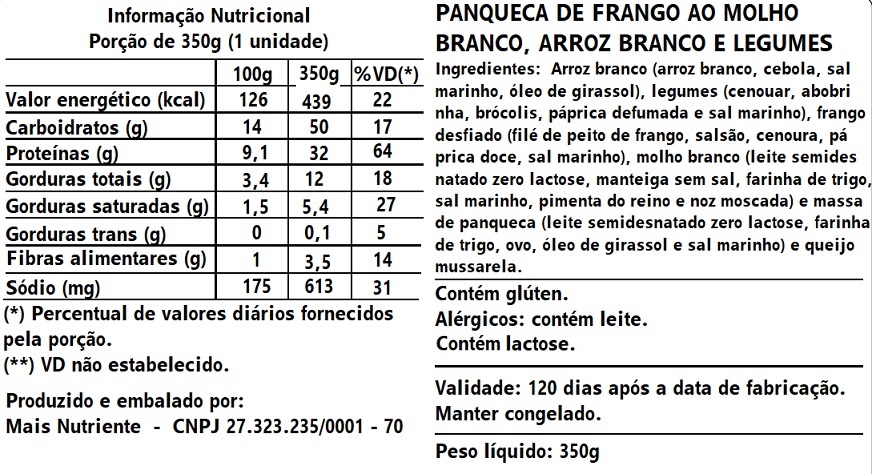 PANQUECA DE FRANGO AO MOLHO BRANCO, ARROZ BRANCO E LEGUMES - 350g